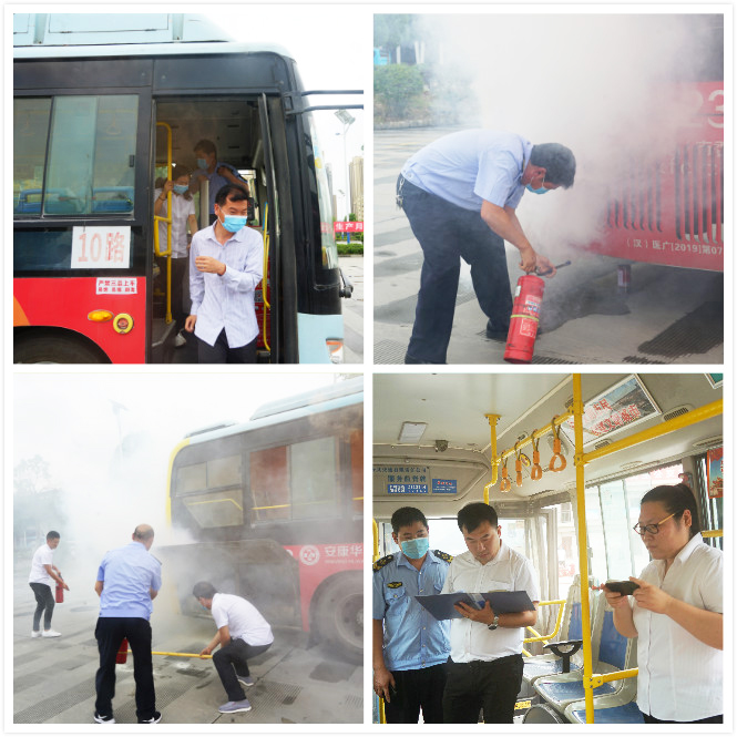 公交車動(dòng)態(tài)安全演練模擬一輛正在行駛中的公交車,駕駛員突然聞到車內(nèi)有異味,發(fā)現(xiàn)車輛尾部發(fā)動(dòng)機(jī)艙在冒煙,駕駛員隨即打開緊急雙閃燈,啟動(dòng)車內(nèi)智能監(jiān)控報(bào)警,向公司智能調(diào)度中心報(bào)警,并立即靠邊停車,打開前后車門,疏導(dǎo)乘客從前后門有序下車,遠(yuǎn)離車輛。駕駛員在檢查車內(nèi)無乘客后,下車查看火情,用車上滅火器對(duì)準(zhǔn)著火點(diǎn)底部滅火,同時(shí)撥打火警電話。搶險(xiǎn)救援組得知后緊急奔赴現(xiàn)場(chǎng),開展事故應(yīng)急救援,事故處理組帶領(lǐng)人員現(xiàn)場(chǎng)調(diào)查和搜集材料,向公司上報(bào)相關(guān)情況。