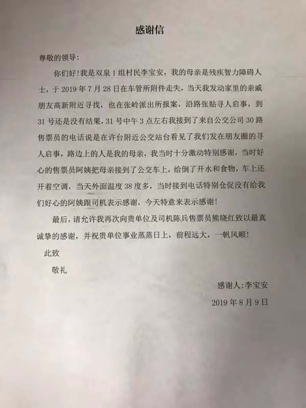 2019年8月9日,市公交公司辦公室收到了一面印有“熱心相助、弘揚(yáng)美德”的錦旗和一封感謝信。